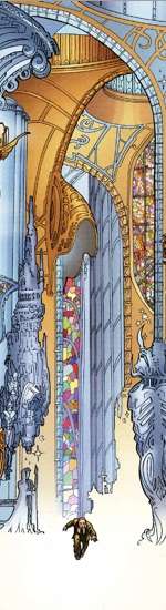 - In Mary Gentle's Orthe series, Golden architecture in general seems to have been made of this trope, which is made much more explicit in the second book, Ancient Light. Like H.P. Lovecraft (whom see), Gentle uses 'cyclopean' in reference to this kind of architecture. The Emperor's throne room, seen in flashback, is poorly lit, so that someone standing in it "cannot see how high the walls are, or how far above is the ceiling of this great hall." It contains "great pillars; yards in circumference, vanishing up into darkness".
