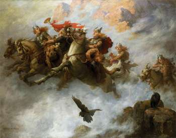 - The Ur Example is of course the Norse Mythology reference. Oftentimes depicted with wings, or riding winged horses, or sometimes ravens. The kenning (poetic title) used to describe their steeds was mistranslated, as they may have instead ridden wolves. Their role was to choose those who died a worthy death in battle and take them to Valhalla, making them Einherjar (lone fighters) who battle in the afterlife, are slain again, but rise every night to feast in the great hall. These warriors prepare for the final battle, Ragnarok. Its worth to note that they originated from bloodthirsty, murderous war spirits, as opposed to the more dignified look they have nowadays. Some sources describe them as far more than just beautiful psychopomps for the heroic dead. They helped make your heroes dead. A random arrow deflected in flight hits a chink in your armor. A broken lace on your boot makes you stumble and gives your enemy the opening to strike you down. Et cetera. All the work of the Valkyries, invisibly flitting here and there on the battlefield to screw over the finest of warriors so that Odin would have the best of the best on his side come Ragnarok. It was how the Norse answered the question "why do the good die young while jerk-asses live forever?" It was also why the original steeds of the Valkyries weren't beautiful winged horses, they were dark and hoary wolves.