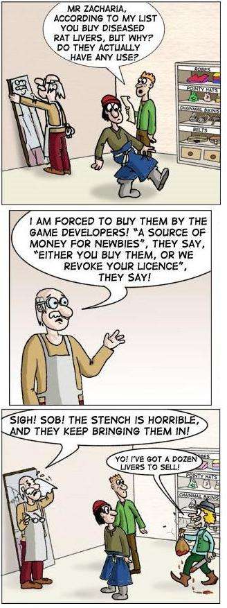 This will often take the form of gold or jewels, if those things don't constitute the Global Currency. The term Vendor Trash can also refer to the weak items and equipment that accumulate in your inventory as you progress through the game (especially by fighting Random Encounters), and that you inevitably sell off in bulk to the first shopkeeper you see once your bag starts becoming full. It can frequently be Justified if the Vendor Trash is some sort of valuable treasure item like a jeweled ring or a bar of gold, or anything else that could reasonably be considered valuable in Real Life. Vendor Trash also offers an opportunity for clever World Building if the player finds out what the merchants actually do with the things you sell them. (But those said, Indeed, vendor trash types of items can become rather silly when they really are useless things which it seems like no one at all would have any use for, ever.)