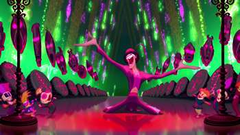 The Villain Song is an over-the-top, gloating cackle about their Evil Plan, philosophy of life (or leitmotive.) Said philosophy is usually that the world is there for the taking, or that the world has wronged them and they will take Revenge, or that they just like hurting people and nobody is going to stop them. The villain usually gets lots of eye candy to go with their song -- live performers will dance up a storm, while animated villains will get pyrotechnics all around them. If they don't get huge visuals, it better damn well be because the song itself steals the show, and trying to distract from that with a lot of flashy visuals is just asking for a chandelier to fall on someone. This song is usually delivered in a minor key and typically features dramatic evidence of the villain's evil nature, such as playful abuse of loyal minions, taunting of prisoners, or random destruction of incidental locations of the villain's secret lair, usually for the purpose of abusing minions or taunting prisoners.