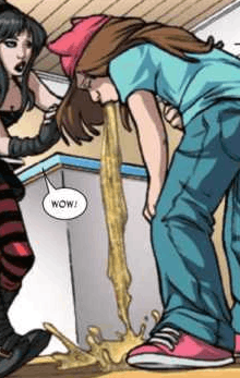 Since the Vomit Discretion Shot is so common, there's nothing better to show off how edgy you are than show the act directly. The grosser, dirtier, and more nauseating, better.