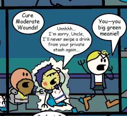 - Order of the Stick: When Redcloak hits Hinjo with Disintegrate, it's enough to knock him out but not kill him. When he's healed, he wakes up mumbling, "I'm sorry, Uncle, I'll never take a drink from your private stash again..."