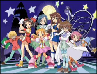 A 12-episode Comedy Anime about a group of singers shooting for the moon, literally. Michael Hanagata, manager of Mix Juice, an Idol group trying to make it big, strikes a deal with Teen Genius Susumu Tsukumo, who believes that man has never actually landed on the moon. He plans to change all that with his eco-friendly experiments, using Mix Juice as his pilots. Once on the moon, Mix Juice will give a concert, a publicity stunt that will rocket the girls to stardom! Or that's the plan, anyway. More often than not, Susumu's experiments (dubbed "Wandabas") end up being derailed by a minor detail, when the girls don't cause them to fail with their squabbling. Things get messy in the second half, when Susumu's mother arrives on the scene and challenges her son to see which of them can get to the moon first. Mix Juice consists of: Himawari Natsuwa, an enka singer, Yuri Fuyude, a rock singer, Ayame Akimo, a folk singer, and Sakura Haruno, a nursery singer.