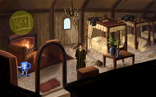 Unusual among adventure games is that all other characters don't stand in one spot waiting for you to talk to them, but walk around on their own schedule. Several puzzles require waiting until a certain character is around, or is not around. For instance, if Drape is in the room, he will counter any spell you cast, which is rather inconvenient. While the items and characters go back as you roll back time, whatever spells you've learned stay learned.