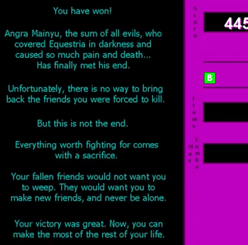 Bob takes things too far, either in his quest for power, revenge, or even just to win a battle. After it's all said and done, he or Alice have to ask 'was it really worth it?' In this case, it's actually a valid question, possibly for a number of reasons. Maybe killing his opponent made him just like them. Maybe to win a friendly duel, he had to shatter his best friend's weapon (or worse, shatter his best friend!) In any case what Bob's done raises serious moral questions for him, and the answer isn't necessarily "Hell yeah, it was Worth It!"