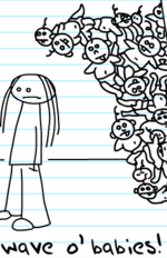 - The Invader Zim episode "Plague O' Babies" revolves around an alien platoon that looks like babies attacking Zim in an effort to take his ship. At the climax they merge their bodies into a walking, monstrous wave of babies.