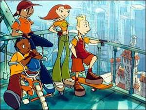Wheel Squad is a really obscure cartoon series focused on a group of youngsters who race on wheels. Mostly roller skates, albeit one of them isn't quite good on them. Their regular enemies are a bunch of juvenile delinquents and a white-collar criminal.