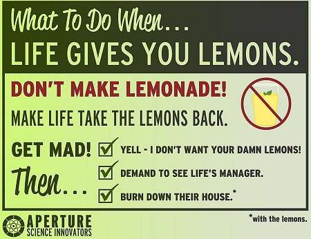 "Don't make lemonade. Make life take the lemons back! Get mad! I don't want your damn lemons! What am I supposed to do with these?! Demand to see life's manager! Make life rue the day it thought it could give Cave Johnson lemons! Do you know who I am? I'm the man who's gonna burn your house down! With the lemons! I'm gonna get my engineers to invent a combustible lemon that burns your house down!" —Cave Johnson, Portal 2 |