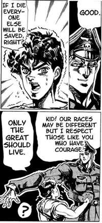 - In Jojo's Bizarre Adventure, Nazi officer Stroheim goes to a group of Jewish prisoners and makes them choose which one of them will be sacrificed to the "man in the column". One boy stands up to offer himself to save the rest, and Stroheim is so impressed by his bravery that he chooses to spare him and kill the rest.