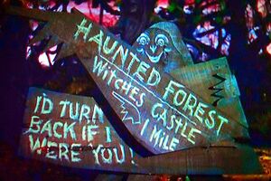 - The page image is from the 1939 version of The Wizard of Oz, where the signs warning travelers away from the haunted forest near the Wicked Witch's castle are not content with just stating the dangers, but really quite insistent on the matter.