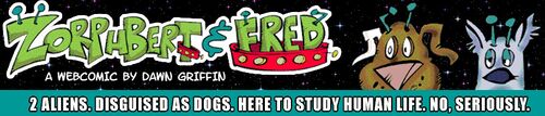 Zorphbert and Fred was a webcomic by Dawn Griffin about two extraterrestrials on Earth disguised as pet dogs in order to study humanity... no, seriously. It used to be updated on Drunk Duck but has since moved to its own domain. It's Exactly What It Says on the Tin, with much of the humour based in the mundane seen through the eyes of an extraterrestrial. They were adopted by expys of the creator and her husband.