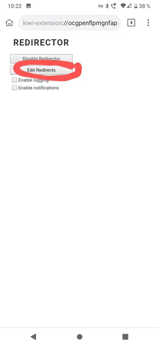 Once you've installed Kiwi (or another browser that supports Chrome extensions), install the Redirector extension (I have no association with its author). Next, click on the three dots on the top right, scroll down, click "Redirector", then click on the "Edit Redirects" button, and then click on "Create new redirect":
