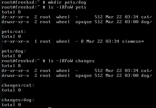 However, a whiteout named dog was added to the directory changes and thus the directory pets. To see the whiteout, the -W option needs to be added to the ls command, as shown below.