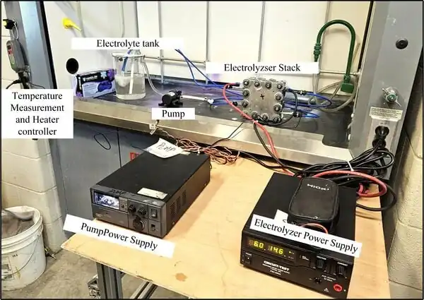 - A pump, designed for a larger electrolyzer model, is also connected and operates on 12V DC to circulate the electrolyte. To ensure the appropriate water flow, the applied voltage to the pump is controlled at 10V.