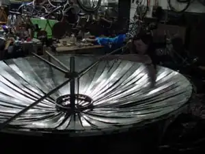 At first, I was open to anything to construct the solar cooker. I was thinking about constructing my paraboloid out of cobb and then sticking small pieces of glass into it as I've seen others do. However, it takes a lot of time to collect the cobb materials and build a paraboloid out of it, let alone one whose focus was accurate. A donated dish was viable, but would not have the heat capacity I was going for, so I set out to find another dish. While rummaging around Arcata Scrap and Salvage one day, I came across an old mesh satellite dish and I knew I had found my cooker. My mentor Bart Orlando and I hauled it to the Bike Library where my cooker began to take shape.