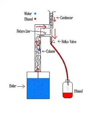 There are many different types of ethanol stills that output a variety of alcohol percentages. I choose a still design that is capable of making high percent alcohol which requires less dehydration before being used as a fuel. An ethanol still heats the mash to the boiling point of ethanol 78.5 oC. The ethanol vaporizes out of the mash mixture leaving behind water and solids. The ethanol vapor then passes a cooling condenser that lowers the temperature so that the ethanol turns back to liquid before being collected. Although the boiler temperature stays below 100 oC, some water vapor comes out with the ethanol. The stills job is to remove water vapor and send it back to the boiler.