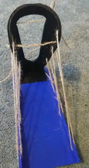 Insert the 8' piece of the Jute String through the top hole on the leg part and then through the furthest hole on the left-hand side of the foot part.