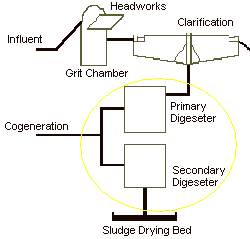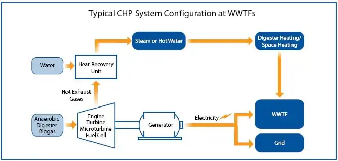 Cogeneration refers to the use of methane, produced in the metabolic digestion of organic material to creating heat and/ or electrical power. The use of Combined Heat and Power (CHP) illustrates the potential for the reduction of energy consumption in treatment of wastewater and the creation of electricity for municipal grids. The Environmental Protection Agency (EPA) diagrams the process in Figure 4, WWTF refers to wastewater treatment facility: Fig. 4: Cogeneration Schematic Source: EPA Wastewater Fact Sheet