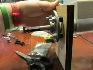 Find shaft collar (looks like a vary large washer about 2in wide) and take out its screw.