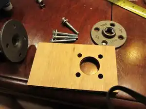 Put the feed screw into the barrel. Place the wood so that the end of the feed screw comes out of the hole. Take the four bolts add a washer to each and put them through the small holes in the nipple connected to the barrel and the small holes in the wood so that the washer is flush with the nipple and the extra is coming out of the wood holes. You may need to people for this step one person to hold the bolts in place and the other to add components. Now add a spacer to each bolt. Add the second nipple so that the flat side is facing the wood. Finish by adding a washer and nut to each bolt and tightening by hand. Check to see if about 1/4in of the feed screw sticks out of the barrel, if not you need to take it apart and adjust the location of the shaft collar.