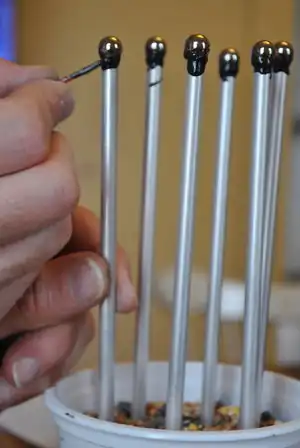 - With the epoxy mixing stick, carefully push the epoxy up onto the ball bearing while rotating the tube in the holder. This helps to maximize the surface area in contact with epoxy, making a stronger joint.Maximize contact area.