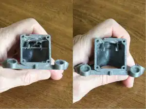 - Remove floor material from the top opening in the end effector with the precision knife. Also remove material from the smaller hole in the top that is attached to the fan opening.Ream out Bowden sheath passage.