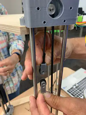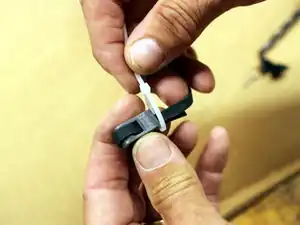 - Rotate the frame such that you're looking at one of the apexes across the interior of the frame. Start a large wire tie through the fixed belt terminator and then back into the interior of the frame through the free belt terminator. Secure the wire tie and use a needlenose pliers or lineman's pliers to pull the wire tie until the belt twangs when plucked (regular pliers tend to cut through the wire tie with potentially catastrophic consequence).Tighten belts.