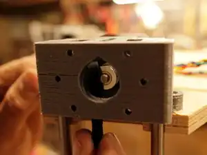 - Create a cartridge of idler bearings and M8 washers in the following sequence: M8 washer - 608zz bearing - 608zz bearing - M8 washer. Insert the cartridge into the interior of an idler end and align as best you can with the 8mm hole.Assemble idler bearings.