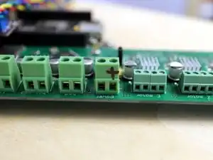 - Locate the supply power terminals in the center Melzi board (marked POWER). Clearly mark the POSITIVE terminal (the terminal nearest the E-MOTOR terminal) with a permanent marker.Mark the POSITIVE terminal on the Melzi.