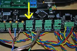 - Connect the hot end thermistor to its respective connectors on the controller board (marked ETEMP). There is no polarity concern.Wire hot end thermistor.