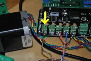 - Wire the motors as shown in the image, wiring the drive motors for U, V and W to X-MOTOR, Y-MOTOR and Z-MOTOR, respectively (see photo - note that connecting two motors to the wrong terminals will result in mirrored prints). The extruder motor is likewise connected to the controller to the terminal marked E-MOTOR. If motor leads are colored differently than shown, identify connected pairs of motor wires by touching the conductors together and noting if additional force is required to rotate the motor shaft. Wire pairs that increase resistance to rotation should occupy adjacent terminals (e.g. the pairs shown in the picture are red-green and blue-yellow).Follow the wiring carefully - click on picture to zoom in.