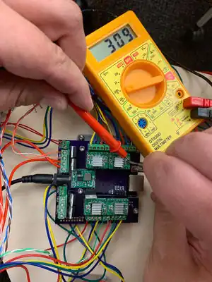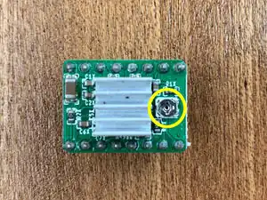 - With a small screwdriver and a voltmeter set for millivolt readings, adjust each of the small potentiometers on the motor controllers to produce a potential of 250 - 300 mV measured between ground (the USB socket can be used for ground) and the screwdriver used to adjust the potentiometer (see photo). Two sets of hands simplifies the task. Be careful to not short anything with the screw driver or voltmeter probe.With the positive probe touching the screwdriver in the pot, and the negative probe touching the USB socket on the Orange Pi, adjust the U, V, W and extruder motor pots until 250 - 300mV is measured.