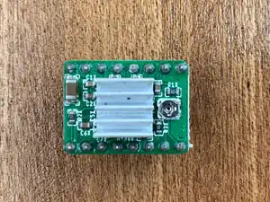 - Remove the adhesive backing paper from the heat sink and affix the heat sink to only the chip on the motor controller boards. Note that the heat sink is NOT touching the soldered pins on the side of the board. There is the potential for a short circuit to occur if it is allowed to touch the pins - avoid this!Affix heat sinks to motor controller chip