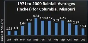A 1900 square foot house with slanted shingle roof in Columbia, Missouri can collect a potential 2500 gallons in the month of March: