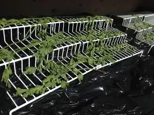 Flatten solar absorber and arrange dehydrator shelves. Absorber can also be wrinkled/ fluffed to increase surface area if an increase in temperature is desired.