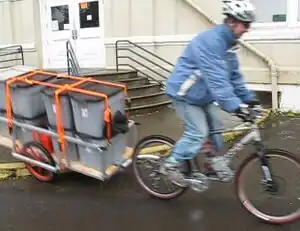 A bicycle trailer is a motorless wheeled frame with a hitch system for transporting cargo by bicycle. It can greatly increase a bike's cargo capacity, allowing point-to-point haulage of objects up to 3 cubic metres (3000 liters, or 4 cubic yards) in volume that weigh as much as 500 kg. However, very heavily loaded trailers may pose a danger to the cyclist and others, and the voluntary European standard EN 15918 therefore suggests a maximum load of 60 kg on trailers without brakes.