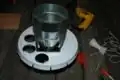 - Secure the fan to the outside of the lid, centered over the hole, with some wood screws. Make sure the air flow of the fan is directed into the bucket. Seal any gaps between the fan and the lid with some sort of gasket (liquid gasket, silicone, glue, tape).