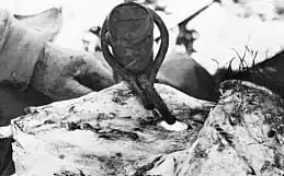 After shooting the animal through the head, quickly bleed it. It is important to bleed the beef as soon as possible, since quick and thorough bleeding results in better tasting meat. To bleed the calf, with a butcher knife, slit the throat horizontally (photo 1) until a constant blood flow begins. Allow the blood to drain thoroughly.