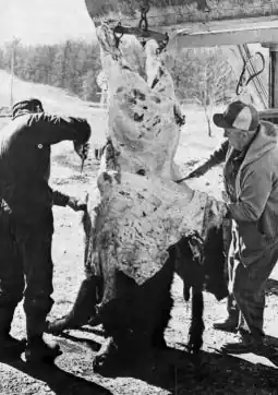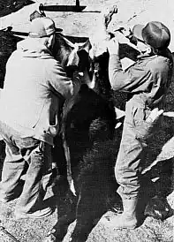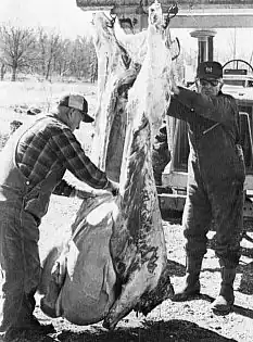 Photo 4--Farrell Burns and Allen Sharp begin to skin the beef starting with the legs.