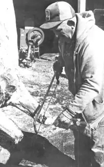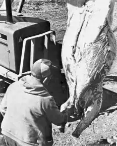 Farrell Burns first learned how to butcher as a young boy, working for his father who was a butcher. When he first butchered, he had only hand tools to use. Today for his home butchering, he uses trucks and power machines to make the lifting easier but the actual dressing the animal is the same.