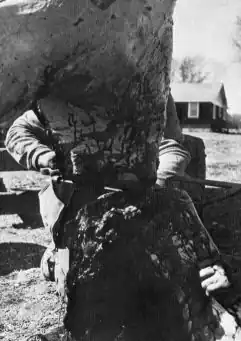 The meat is usually quartered to make it easier to handle. To quarter it, saw between the ribs horizontally, completely through the side. The meat should be quartered between the second and third ribs, leaving two ribs on the top quarter and the rest of the ribs on the bottom quarter (photo 18). The two quarters left hanging on the single tree should be equally balanced. If they are, then the beef was butchered and quartered correctly. After aging three days it may be cut into separate cuts.