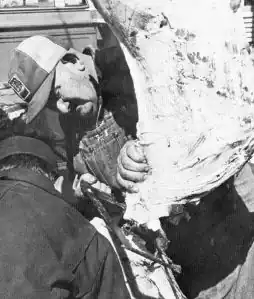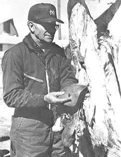 To remove the brains, split open the head from the eyes to the nose with an ax. Chop through the hide and all the way through the skull. Then reach in and pull out the brains.