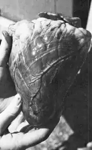 When the calf is cut completely open, the entrails can come out. Gently apply pressure to the entrails starting at the top and pull them from the inside cavity of the beef until they come out (photo 12) Then lightly push them down toward the wash tub or container to catch them. Be extremely careful not to break open any organ, because a puncture will make the gutting very messy. There are four chambers to the calf's stomach. Be extra careful not to break them, because partially digested food and stored matter are in the stomach chambers. As you pull out the intestines, separate the liver (photo 13). The lungs and heart (photo 14) will come out next. Put liver and heart in water to clean them.