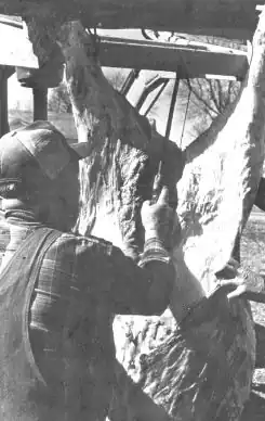 Butchering also takes very few utensils which most farmers have. First you must have a few well-sharpened knives. You should have a large knife for slitting the throat and cutting the beef open. Next, you need one smaller knife for each person helping to skin the beef. You also need a device to hang the beef up--a rope and pulley around a tree limb, or anything on which to suspend the beef and hold it during the butchering process. It is also helpful to have a single tree, a wooden bar with hooks on each end, to fasten the beef to when hanging it up, for the calf must have both legs secured to do the skinning and cutting effectively.