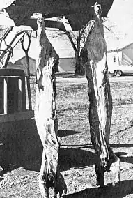 Photos 7 and 8--To skin the front legs, first slit the hide down the leg and peel the hide off the leg with a knife.