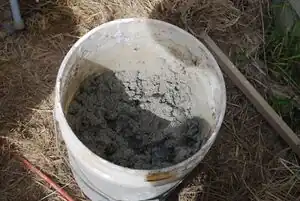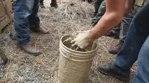 Combine the plaster ingredients. We used 1 part slaked lime, 3 parts river sand, and horse manure "to taste", which was about 4 handfuls in our 5 gallon bucket. Combine these slowly while blending with a paint mixer. The final plaster should hold its shape and have noticeable fibers when broken apart.