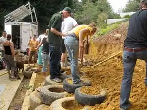 Recycled materials such as tires and wood are used with the clay found at the site to shape the swale garden.