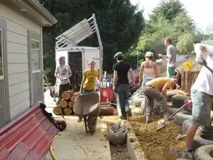 - 10/29/08 - Last day of work. Secured log retaining wall with wire and screws. Made a gravel walkway along herb bed. We finished the earthship retaining wall, that is also part of a garden bed for herbs. Decorative plants can be grown in the soil inside the tires in the earthship wall. CCAT is building a rainwater catchment system and we incorporated the tank into our wall. The herbs when they are planted will have water conveniently available. Yay!