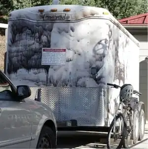 In December 2010, CCAT lent their Mobile Energy Operations Wagon (MEOW) V1 to a local eco-hostel. While away from the CCAT house, the 720 W photovoltaic (PV) trailer was stolen and vandalized. Some days after the burglary, CCAT received a call from the local police who said they had found the MEOW V1 abandoned on the side of a nearby highway. It turns out that the vandals had broken the hitch lock, attached the trailer to their own vehicle, and drove it miles away where they could remove all the components of value (i.e. the 720 W array, batteries, charge controller, and inverter) in a less conspicuous area. After the vandals stripped the trailer of all high-value components, they covered the trailer with a patchy coat of black spray paint to make it seem as though the trailer had been deserted by its owner (Fig 1)