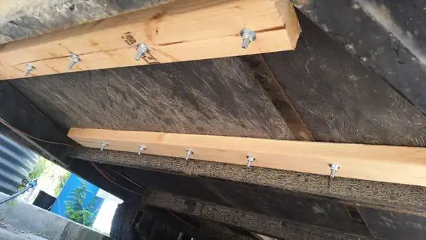 Step 6:Now place the battery case where the new holes were drilled. Move the wood planks to the underside and place bolts through the holes. |